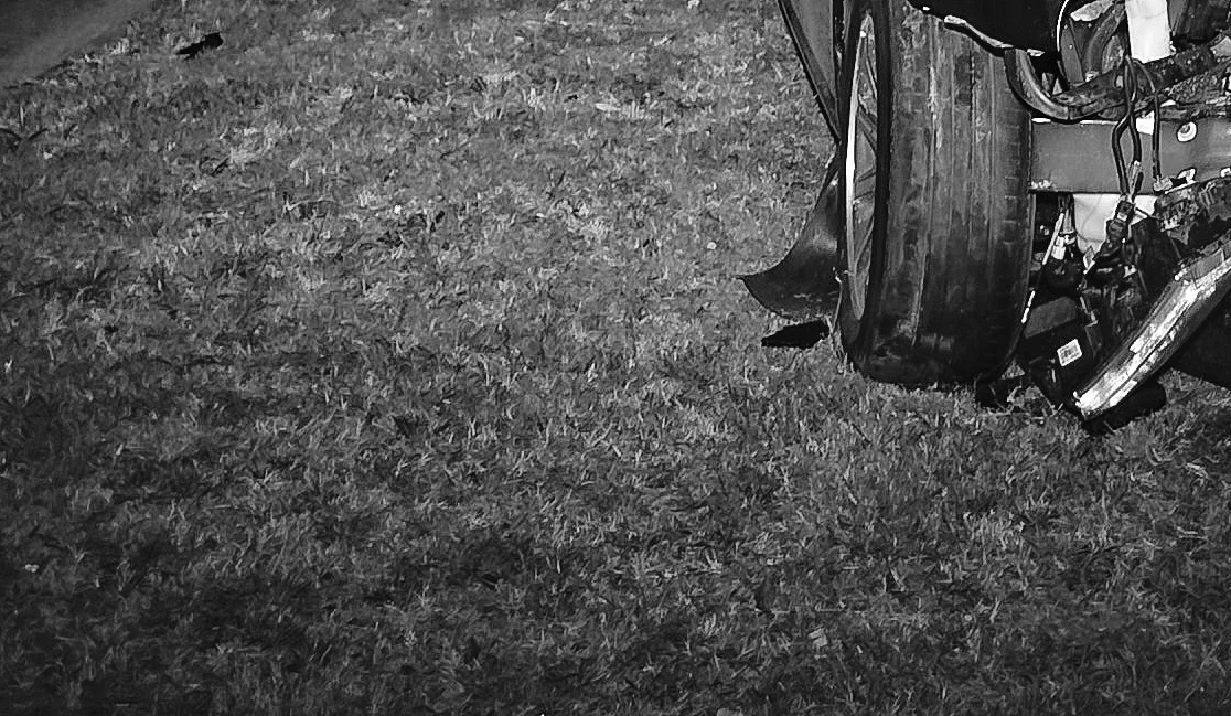 More than that, he felt it in his chest like a deep cold returning. He let go of the green mower and his hands stayed open as he searched for the sound. His neck fell into his clavicles, as if he were preparing for falling bullets. As he turned around, he saw it. The silver Mustang crunched against the black oak in his front yard. The front end looked the opposite of a snake shedding its skin. The silver hood looked like a serpent trying most unnaturally to tuck itself back into the sheath of its youth - an overgrown serpent trying to push itself into its birth sac. The silver body spilled out of the crunched, tube-like frame and pieces were scattered and smoking. The windshield was a spider web on white fire.